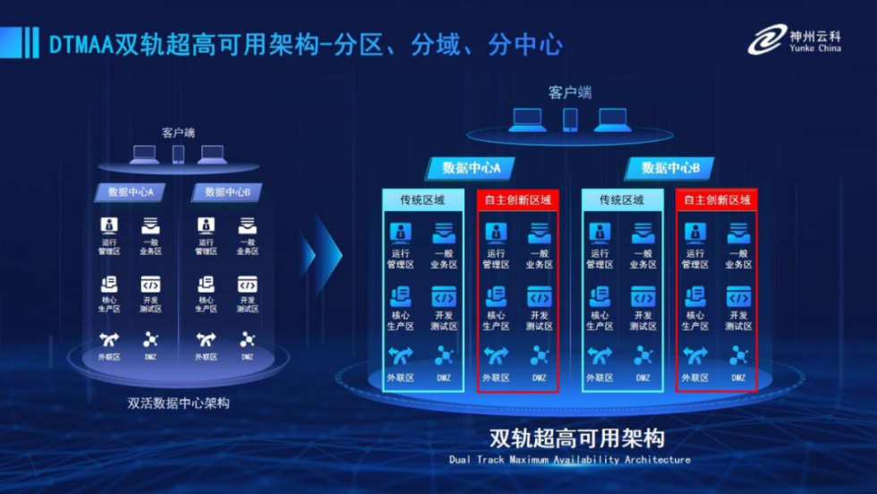 为帮助金融客户更好地应对数字经济时代对可持续性的高要求,实现“信创”与“数字化”齐头并进,美港通官网推出了双轨超高可用架构。该架构在双活数据中心的分区调度基础上,增加信创域和非信创域的分域调度,实行信创域与传统域应用全量部署,使双中心运营变为双中心四区域并行运行,互为多活,将“0到1”的单轨建设道路变为分区分域协同的多活双轨超高可用架构。帮助客户在新架构下,保障“信创”的同时解决性能瓶颈,提升稳定性,保证应用可持续性,最终实现信创区域和非信创区域的平滑过渡,完成国产化替代目标。